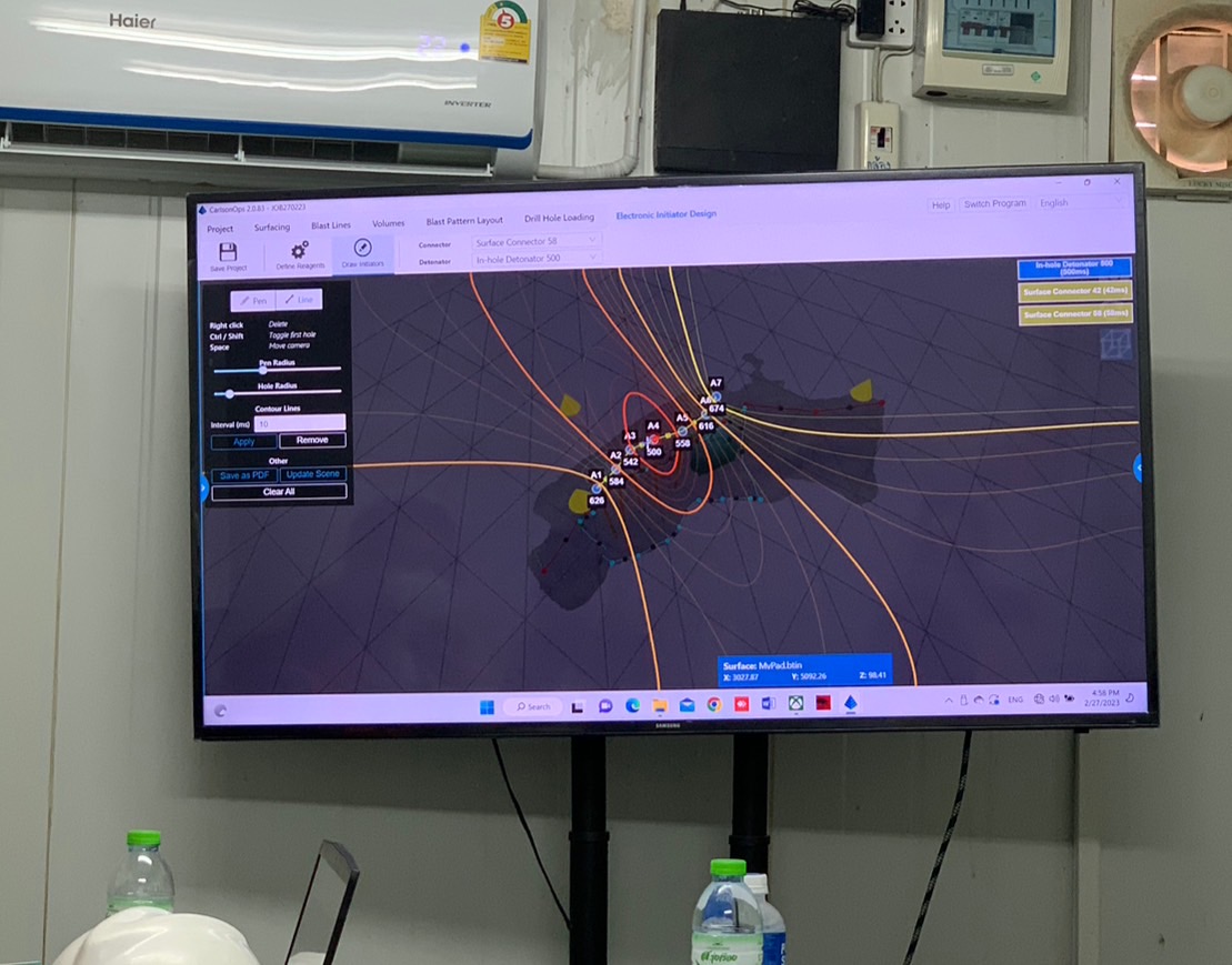 - ส่วนหลุมเจาะระเบิดจะใช้เครื่อง Boretrak2 วางลงในหลุมที่เจาะ ที่หน้าจอ Tablet สามารถแสดงค่าต่าง ๆ เช่น ความลึก ความเอียง ค่าแตกต่างระหว่างหลุมที่ออกแบบกับค่าที่วัดได้จริง ฯลฯ เป็นภาพกราฟฟิกแบบ 3D เมื่อเก็บข้อมูลเรียบร้อยแล้ว ก็นำข้อมูลไปประมวลผลและวิเคราะห์บนคอมพิวเตอร์ผ่านโปรแกรม Carlson Blast OPS พร้อมแสดงเป็นรายงานให้ทีมงานก่อนดำเนินการระเบิด